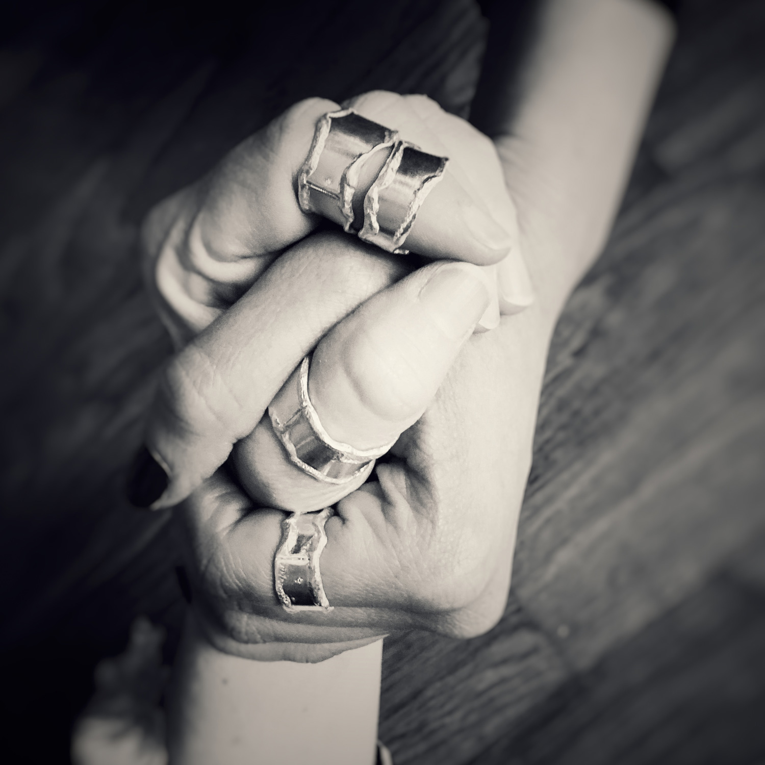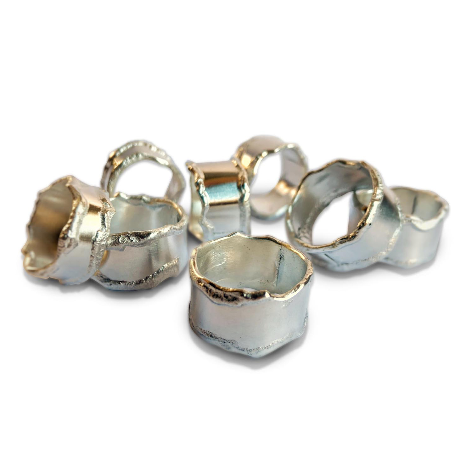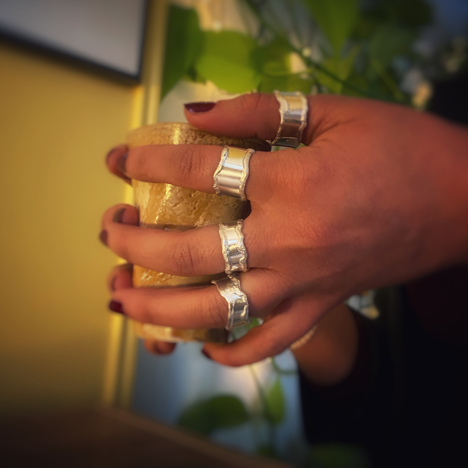 Un véritable classique de la marque, des anneaux en argent d’une élégance brute. Chaque anneau est façonné à la main avec une finition unique qui assure qu’aucun anneau n’est identique à un autre. Chaque création capture l’essence de l’artisanat d’art, offrant à ceux qui les portent une touche d’individualité et de caractère.