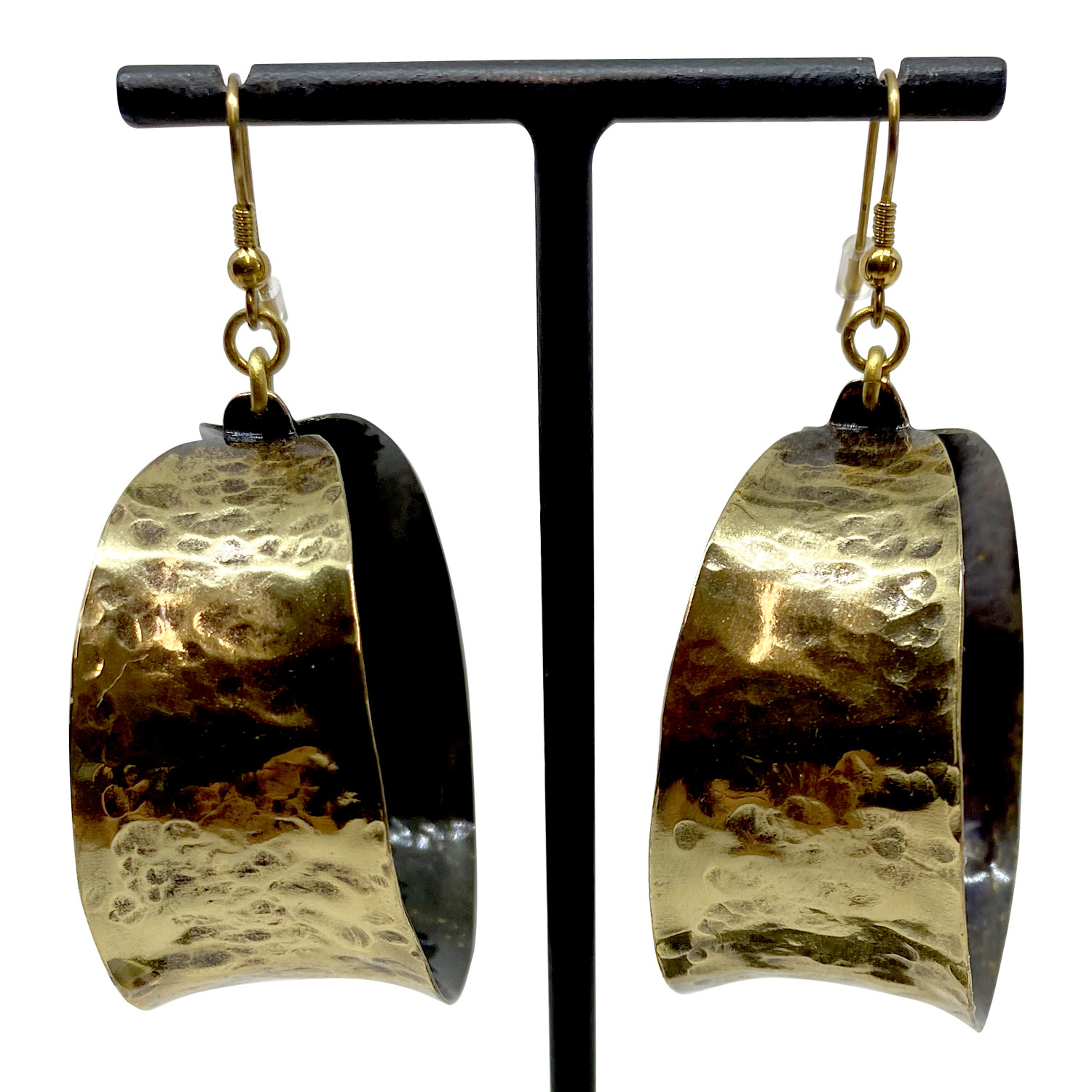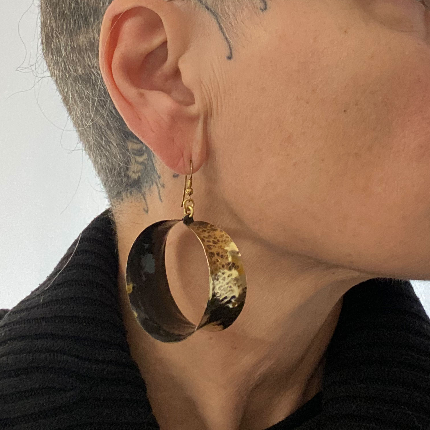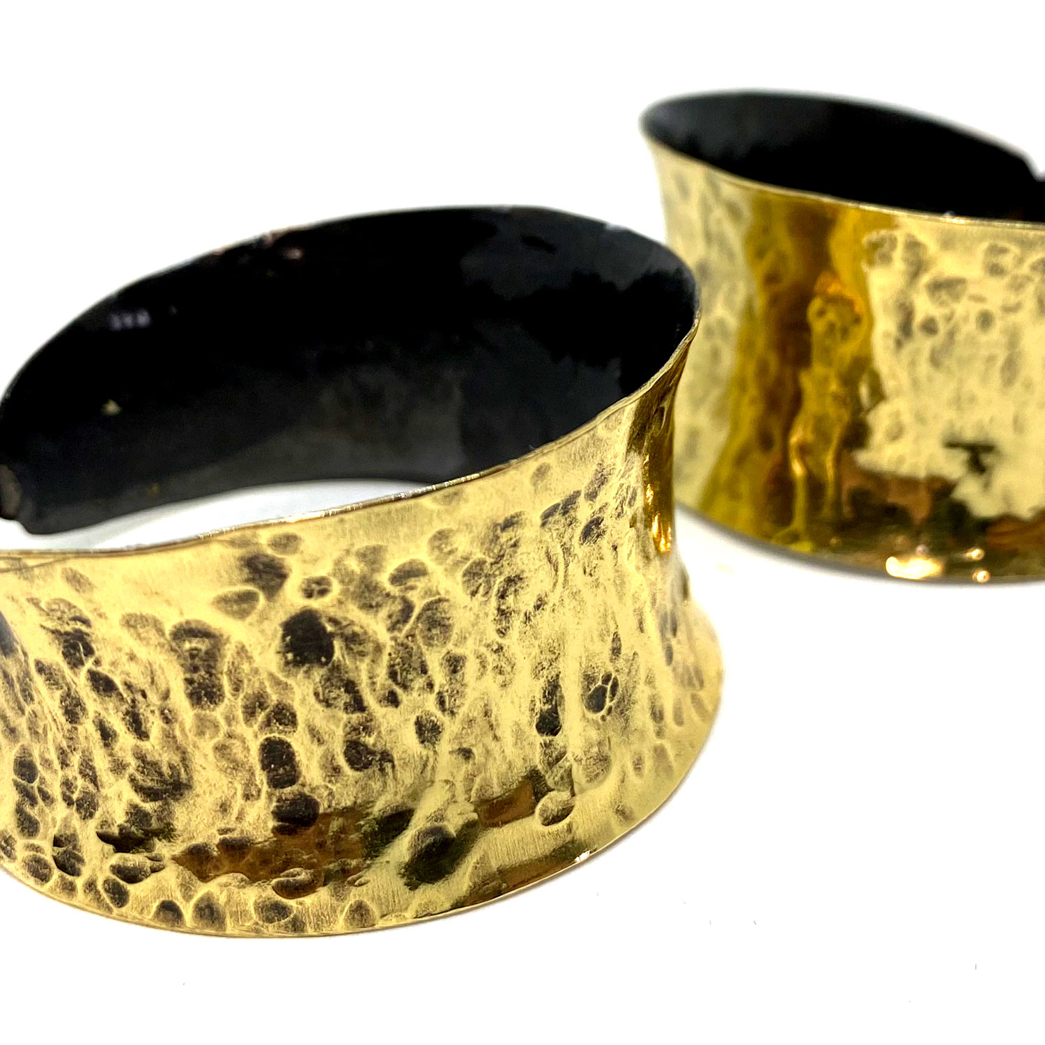 La surface martelée et chatoyante de ces boucles d’oreilles invite au toucher, témoignant du travail méticuleux accompli par des mains expertes. Leur finition patinée, à la fois subtile et éclatante, dévoile des nuances chaudes, créant un contraste saisissant avec la brillance étincelante du métal.