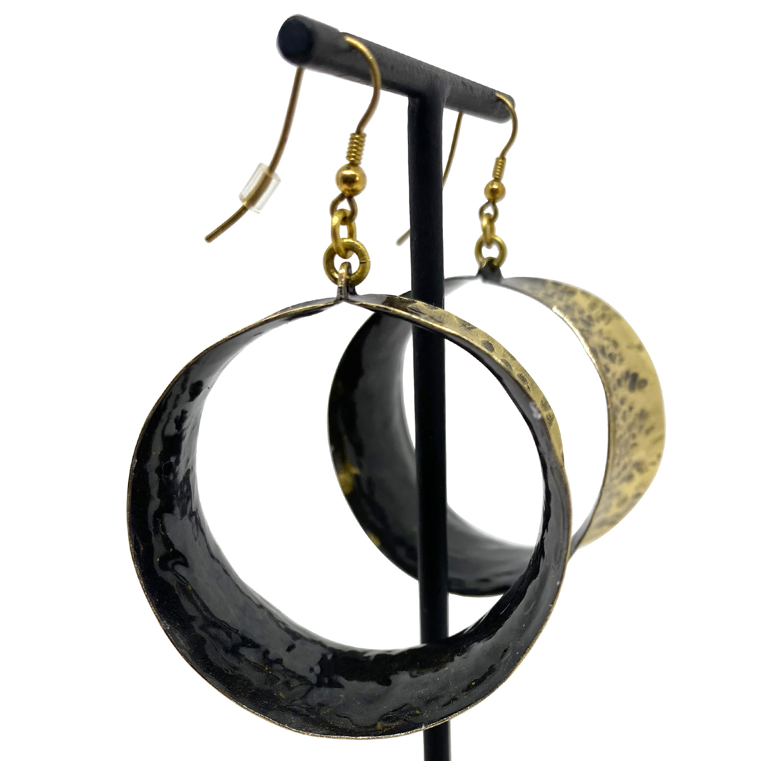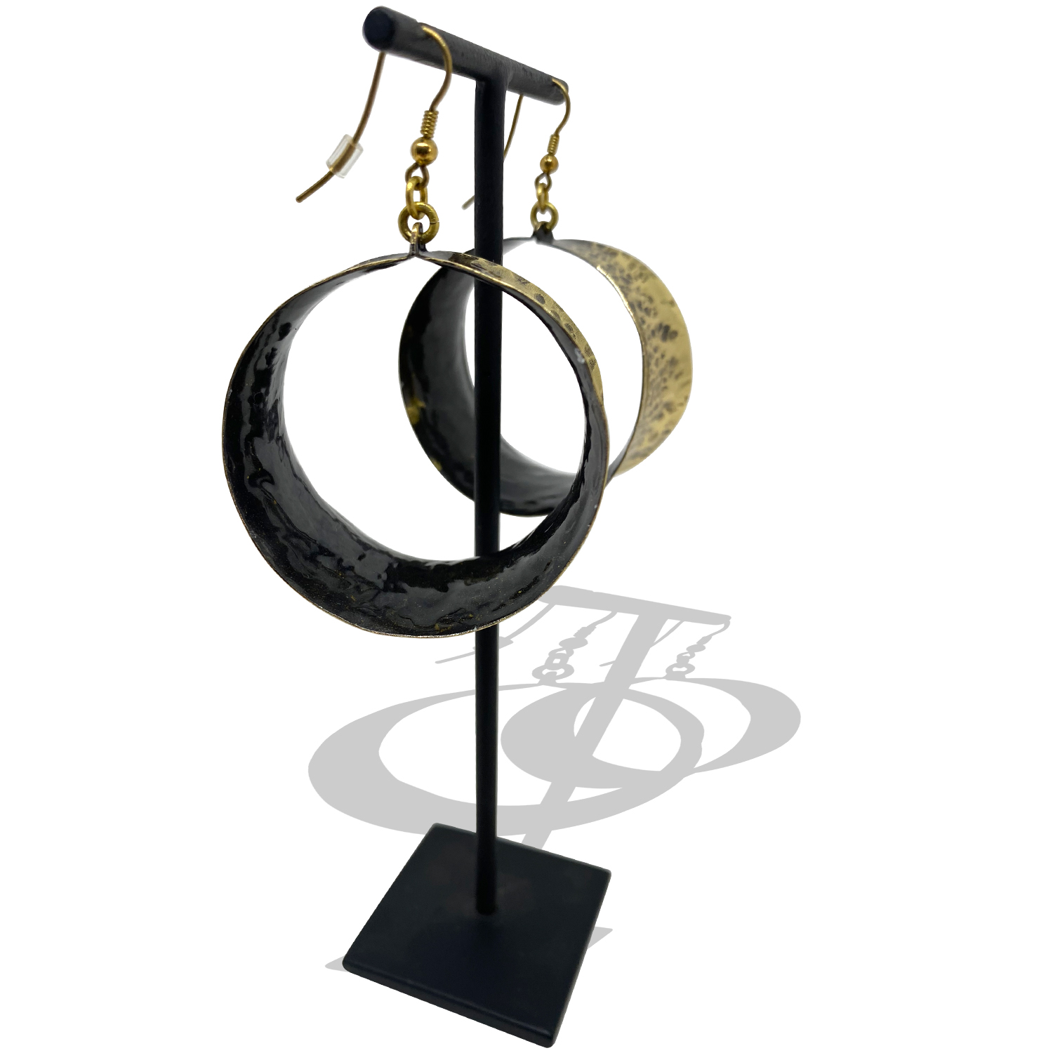 Dans un éclatant mariage entre l’artisanat méticuleux et l’élégance contemporaine, naissent ces magnifiques boucles d’oreilles : des anneaux forgés dans du laiton patiné et brillant. Ces accessoires captivent l’essence même de l’audace et du raffinement.