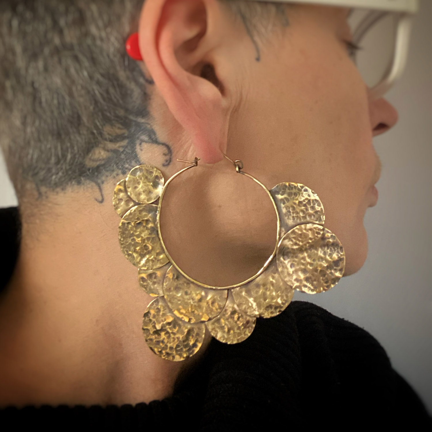 Cette pièce polyvalente ne se contente pas d’attirer les regards : elle incarne la confiance et l’individualité de celle qui les porte. Que vous souhaitiez rehausser votre tenue de soirée ou apporter une touche d’audace à votre look quotidien, cette créole en laiton martelé sont le choix parfait.
