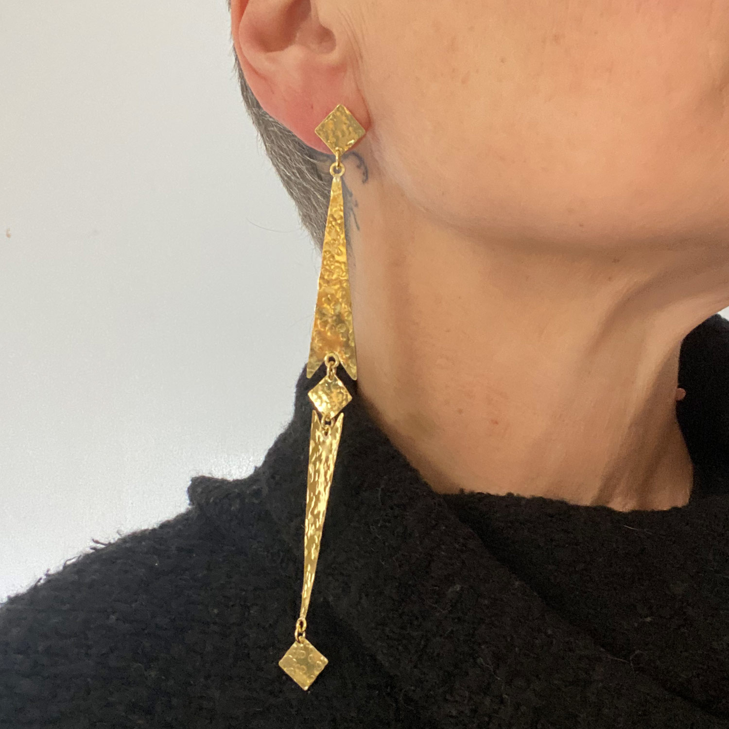 La longueur extraordinaire de cette boucle d’oreille crée un effet visuel saisissant, évoquant la puissance et la précision d’une flèche en plein vol. Chaque centimètre de la boucle est façonné avec soin à partir de laiton martelé, ajoutant une texture riche et un éclat subtil à cette œuvre d’art contemporaine.