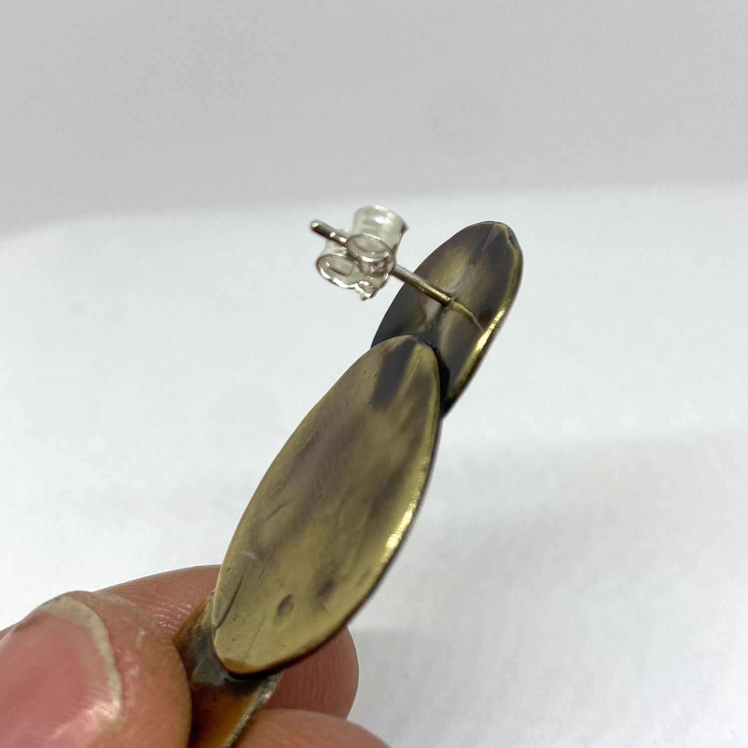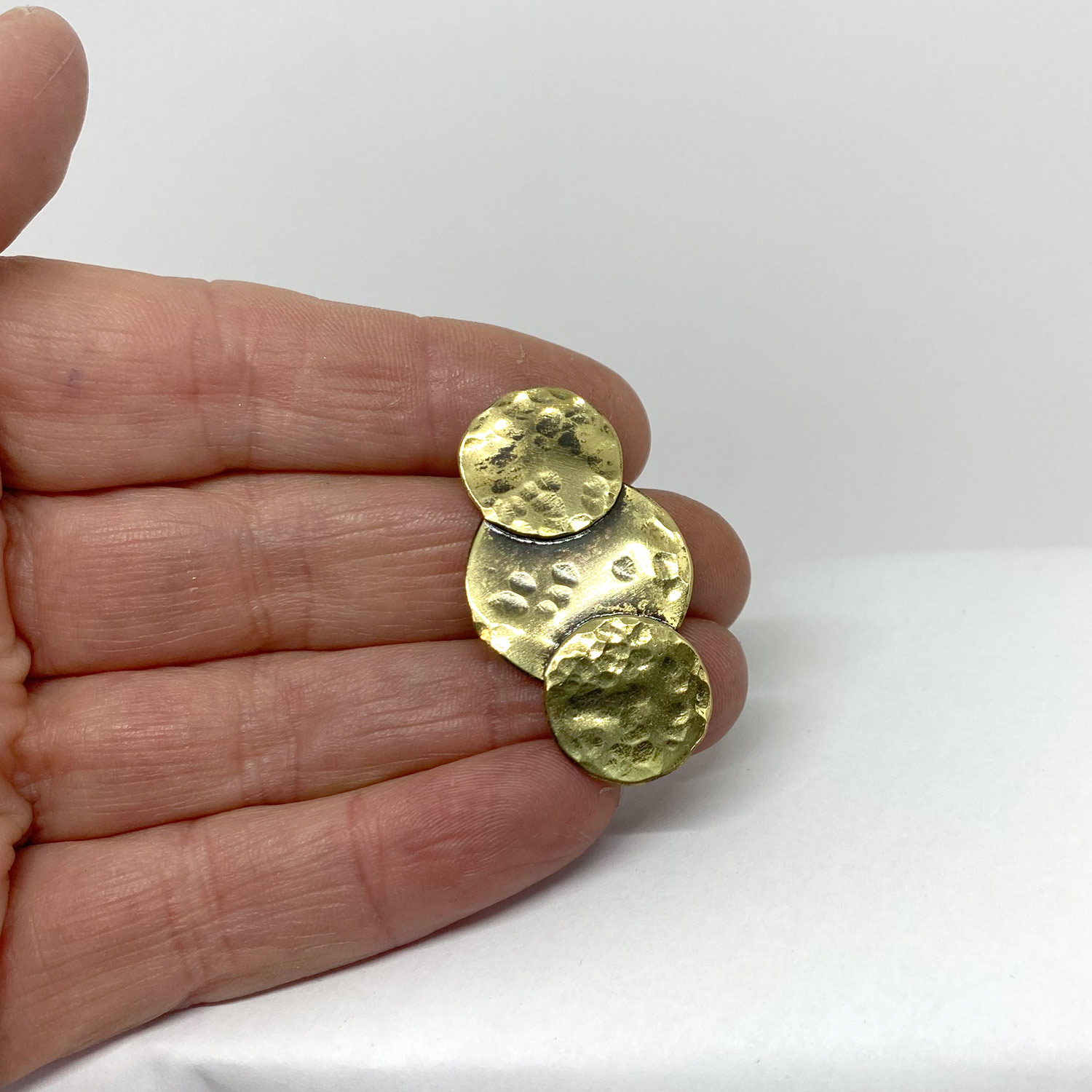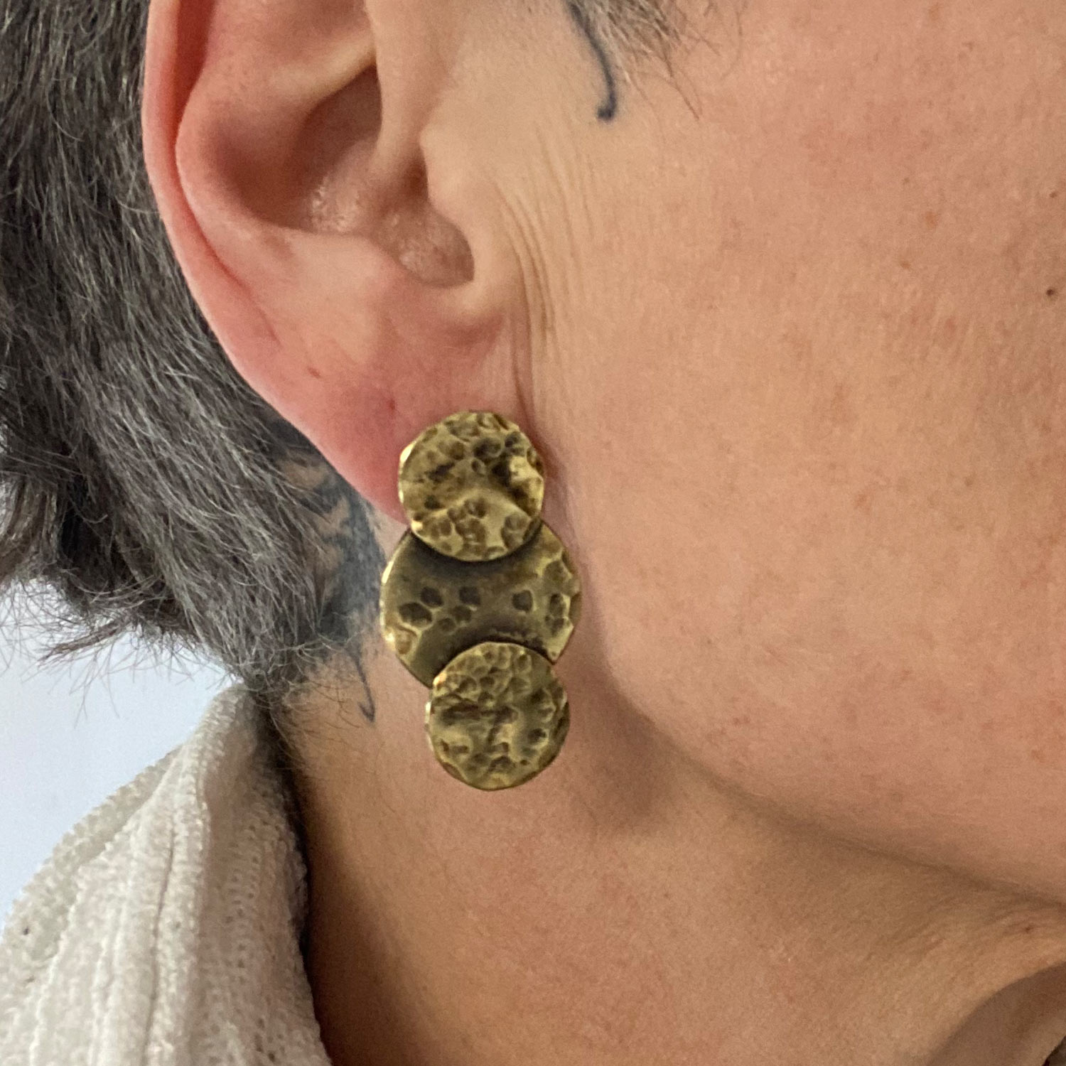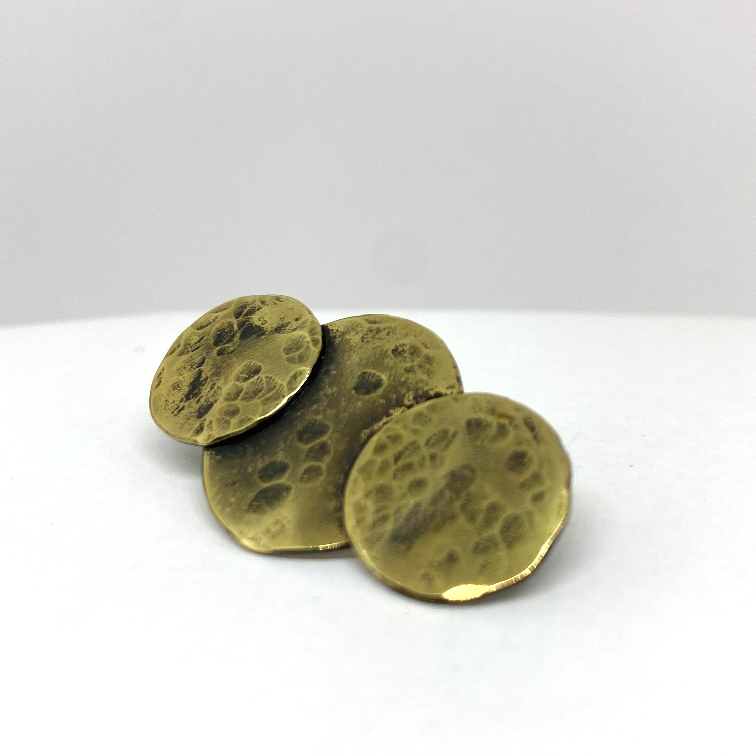 Le laiton martelé ajoute une texture distinctive à la boucle, créant un effet visuel saisissant qui attire instantanément le regard. Son aspect artisanal confère à cette pièce un caractère authentique, faisant de chaque boucle une œuvre d’art unique à part entière.