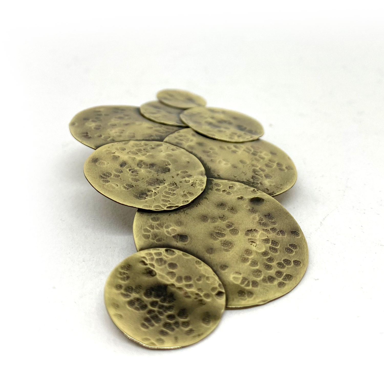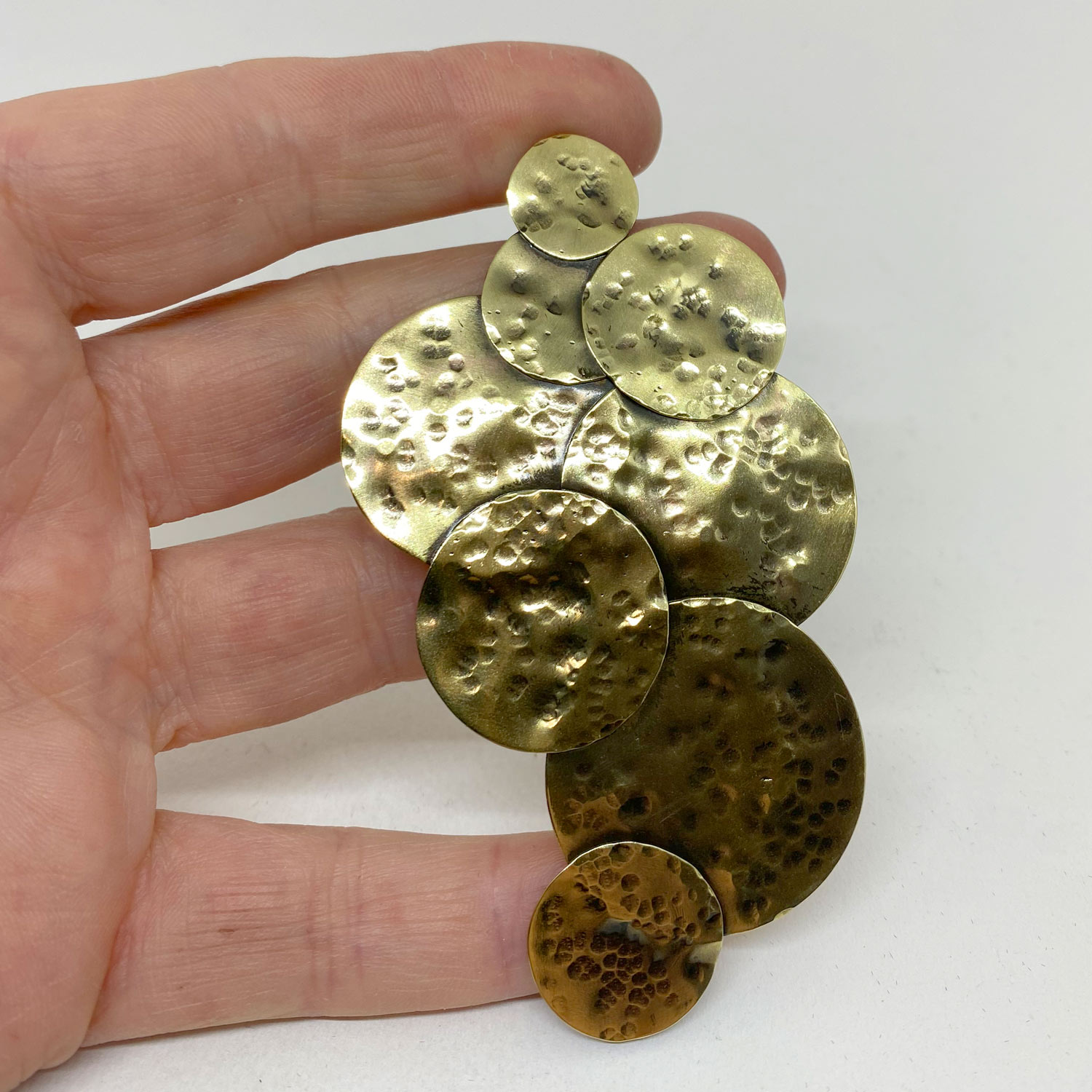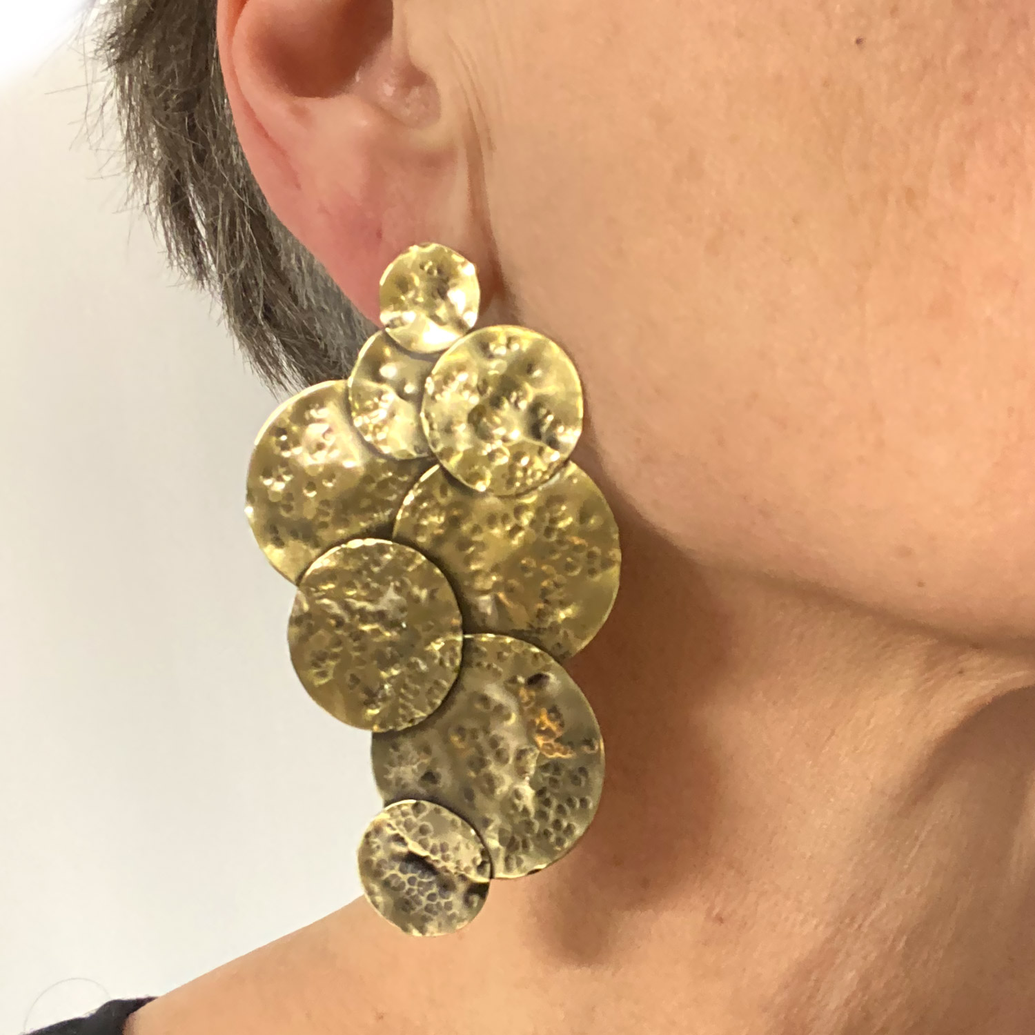 Le laiton martelé ajoute une texture distinctive à la boucle, créant un effet visuel saisissant qui attire instantanément le regard. Son aspect artisanal confère à cette pièce un caractère authentique, faisant de chaque boucle une œuvre d’art unique à part entière.