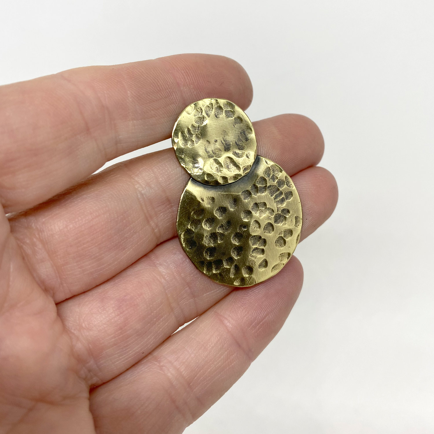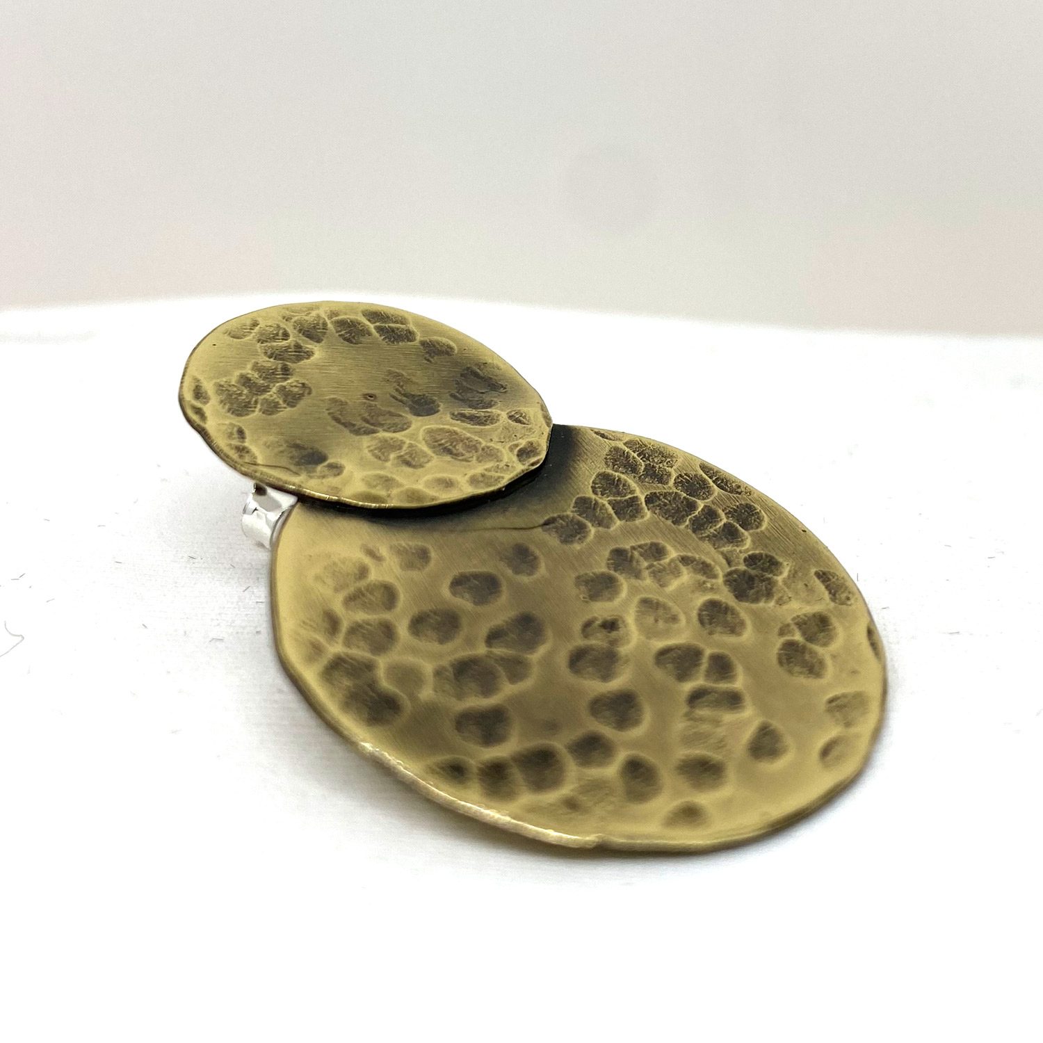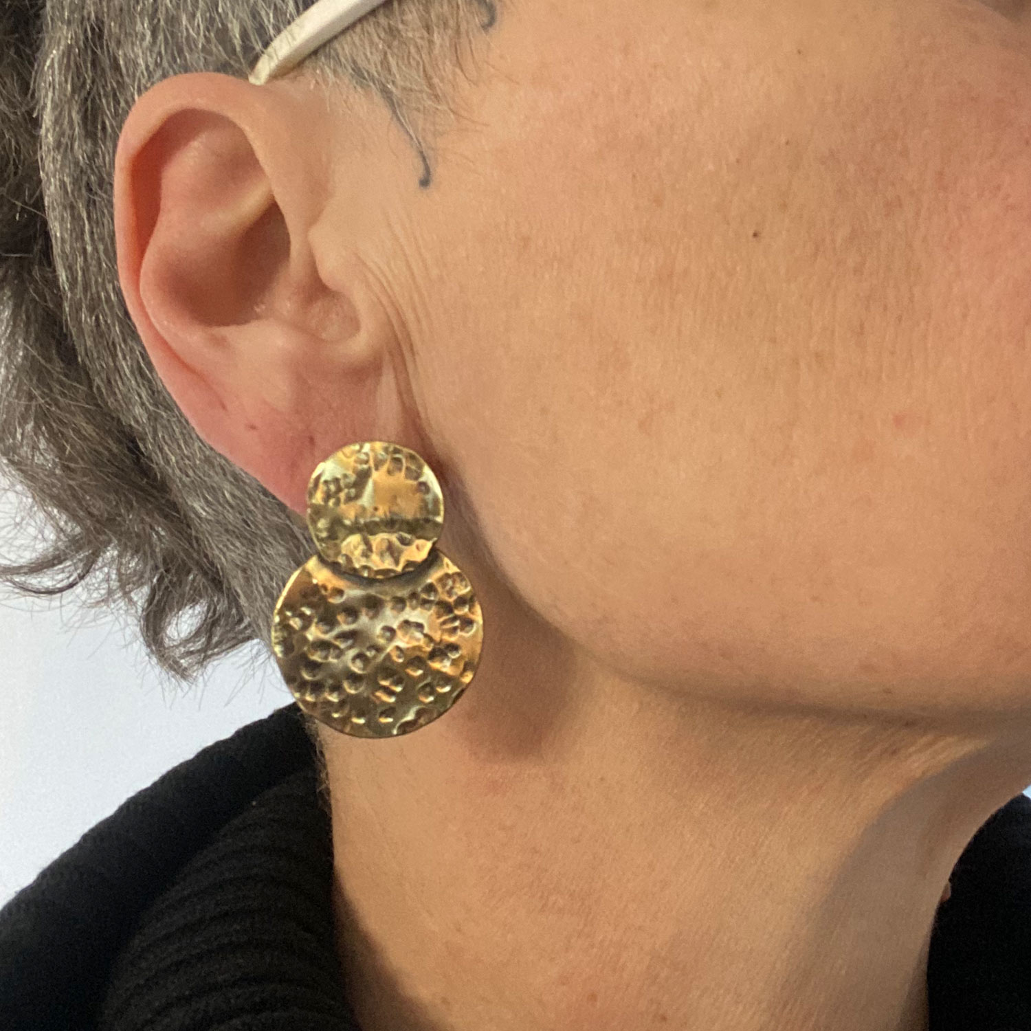 Le laiton martelé ajoute une texture distinctive à la boucle, créant un effet visuel saisissant qui attire instantanément le regard. Son aspect artisanal confère à cette pièce un caractère authentique, faisant de chaque boucle une œuvre d’art unique à part entière.