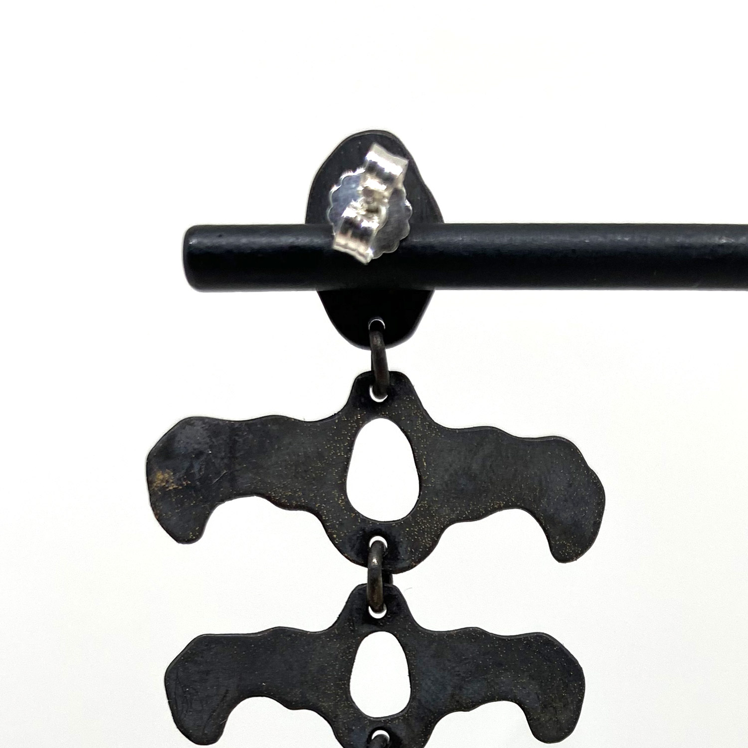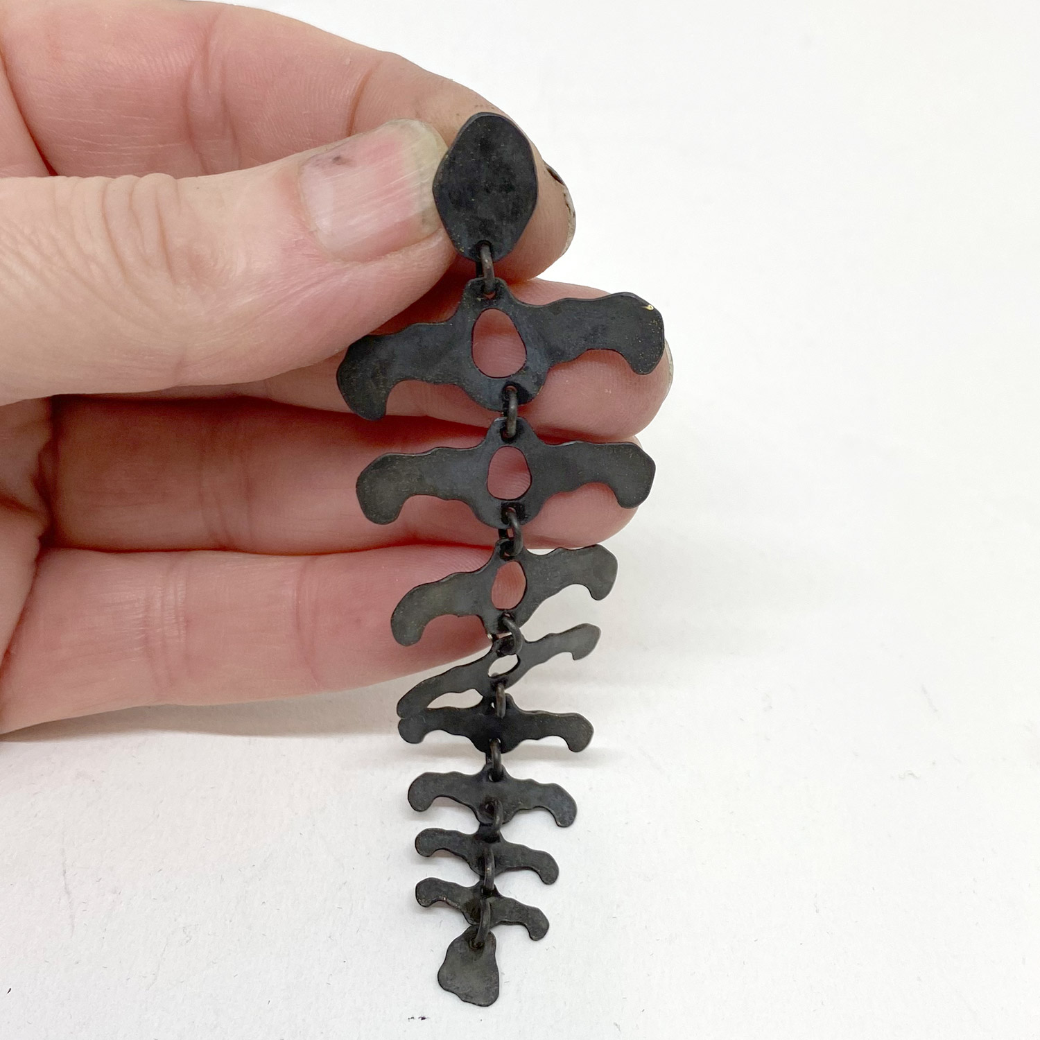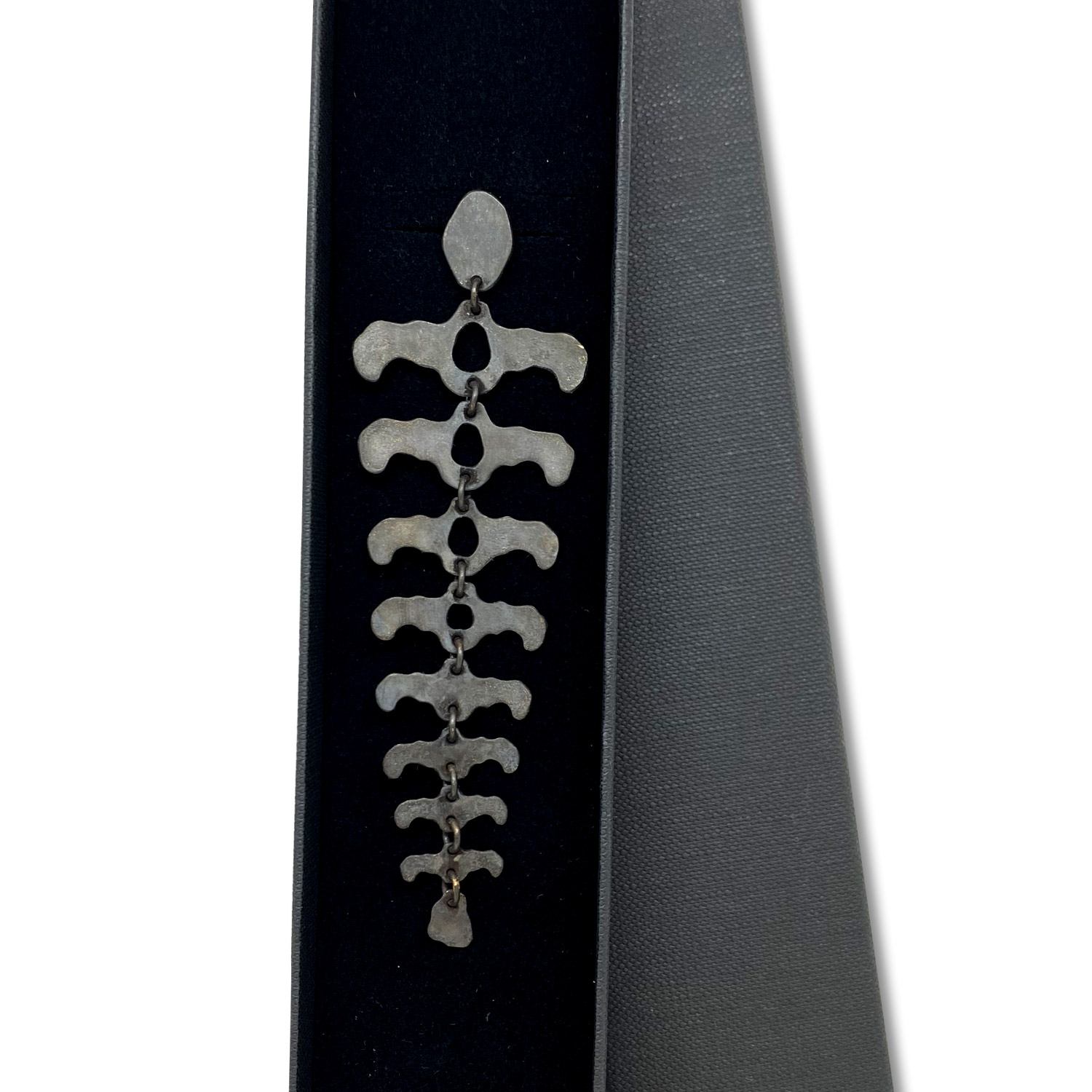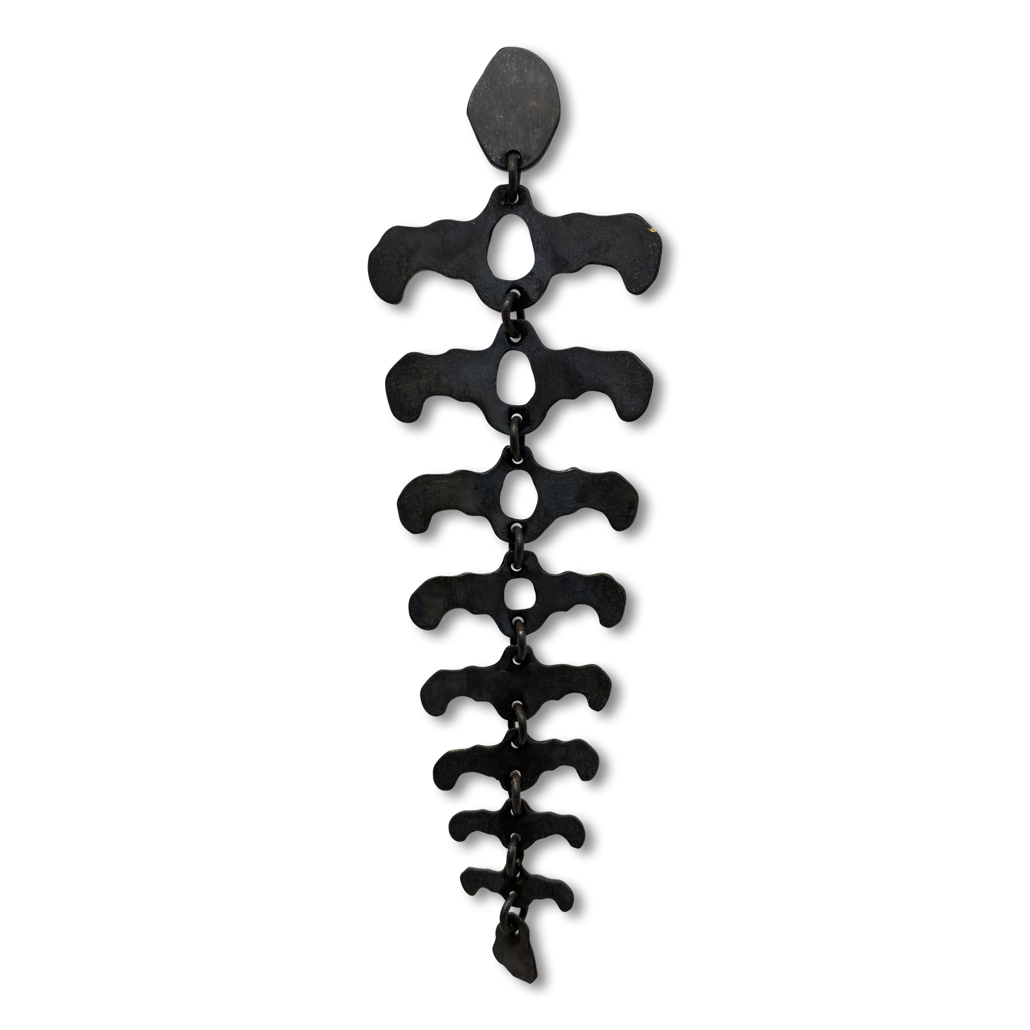 Une longue boucle d’oreille en laiton patiné noir, minutieusement sculptée pour évoquer la délicatesse et la beauté de la colonne vertébrale.