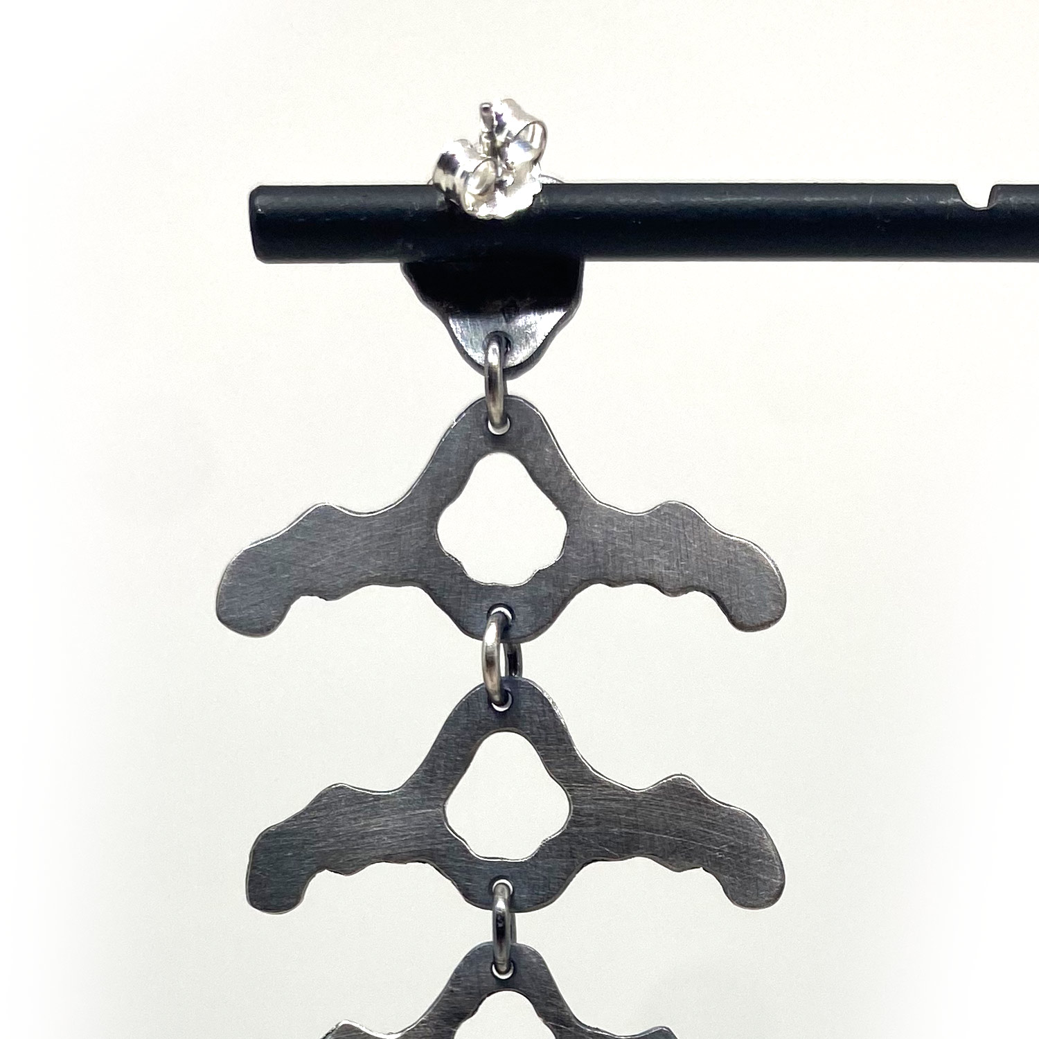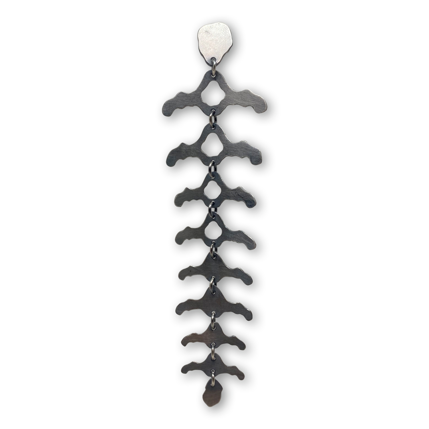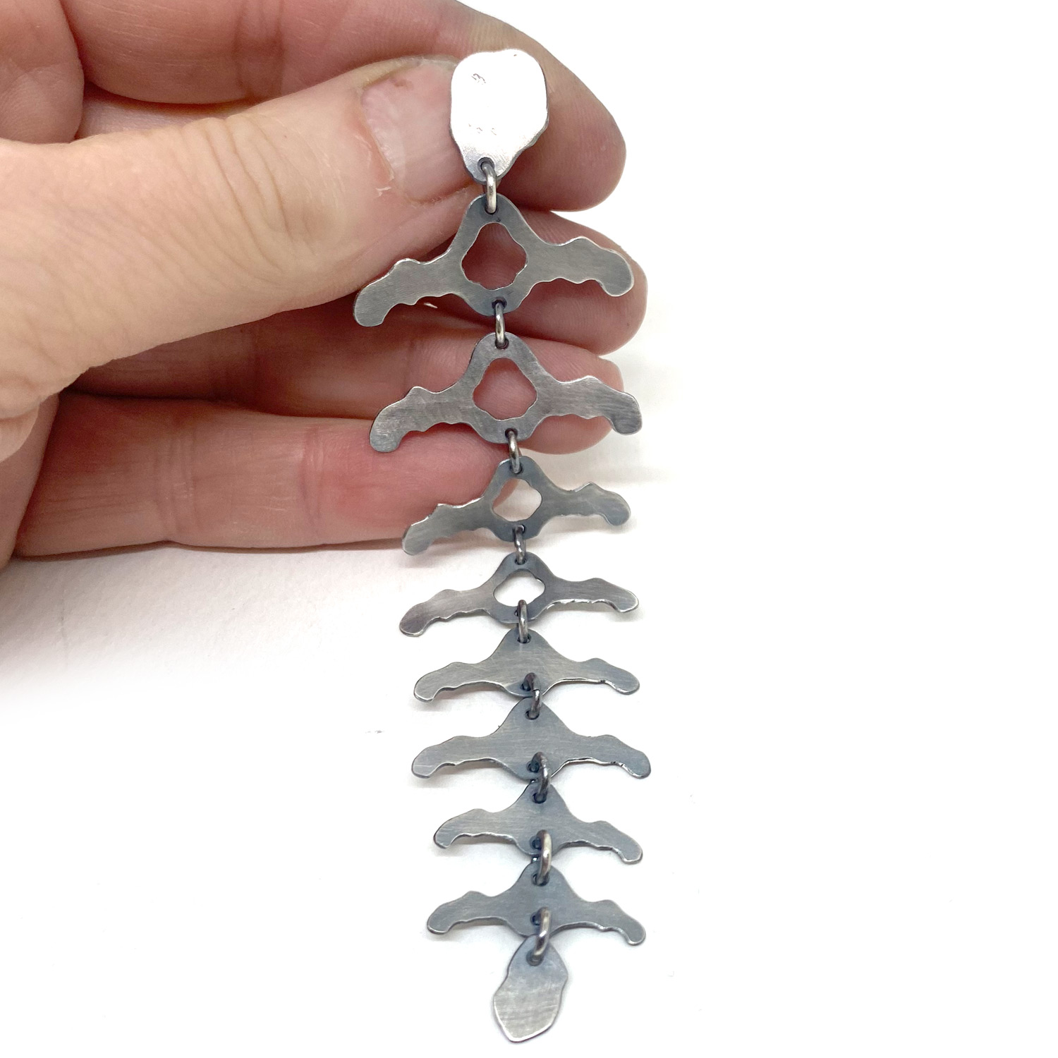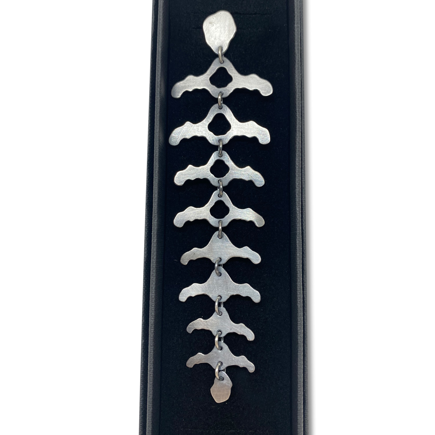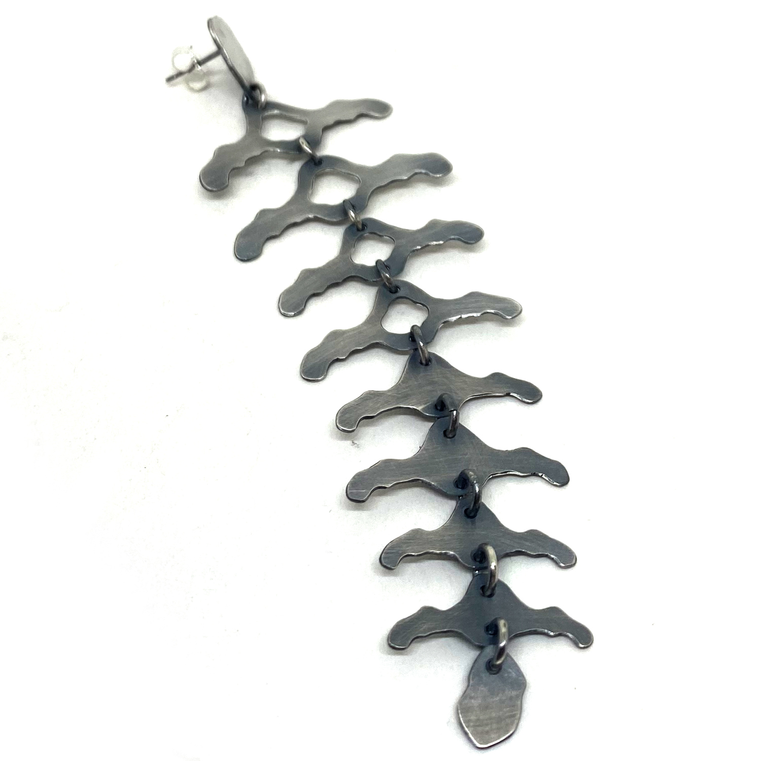 Découvrez l’éclat mystérieux et captivant de notre nouvelle création : la longue boucle d’oreille en argent noirci, délicatement façonnée pour évoquer la fragilité de la colonne vertébrale.